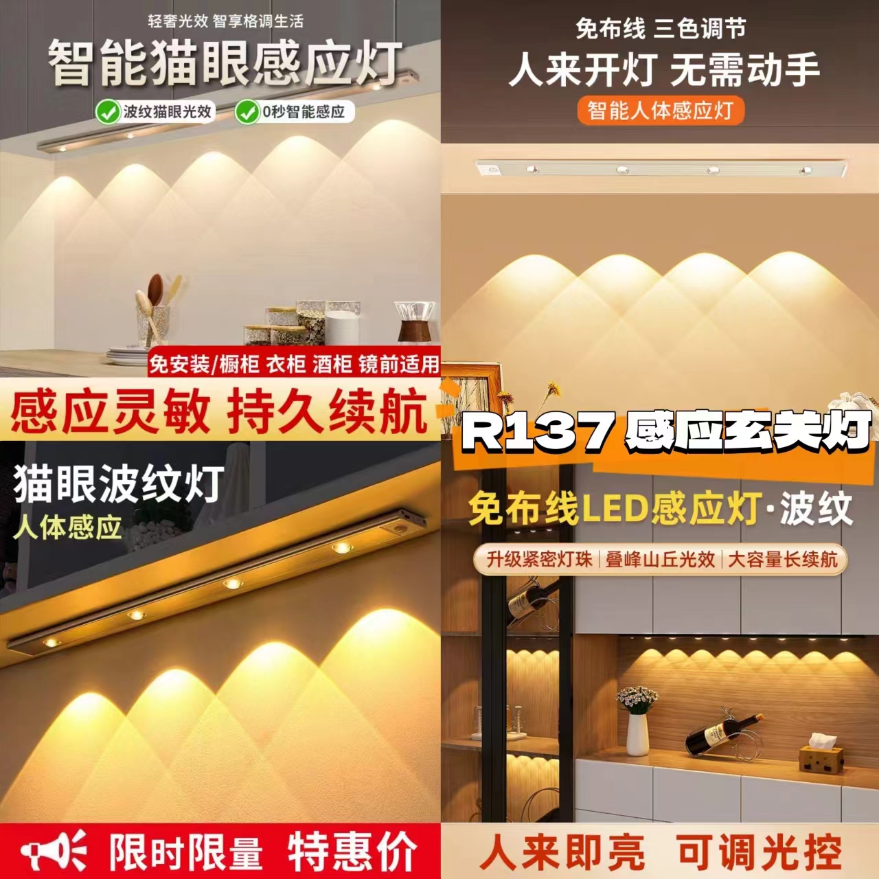 小山丘猫眼橱柜灯,人体感应灯免布线磁吸安装充电玄关酒柜灯波灯带 【50cm四灯】 #VsTeam全马第一手价 #下单送礼物🎁
