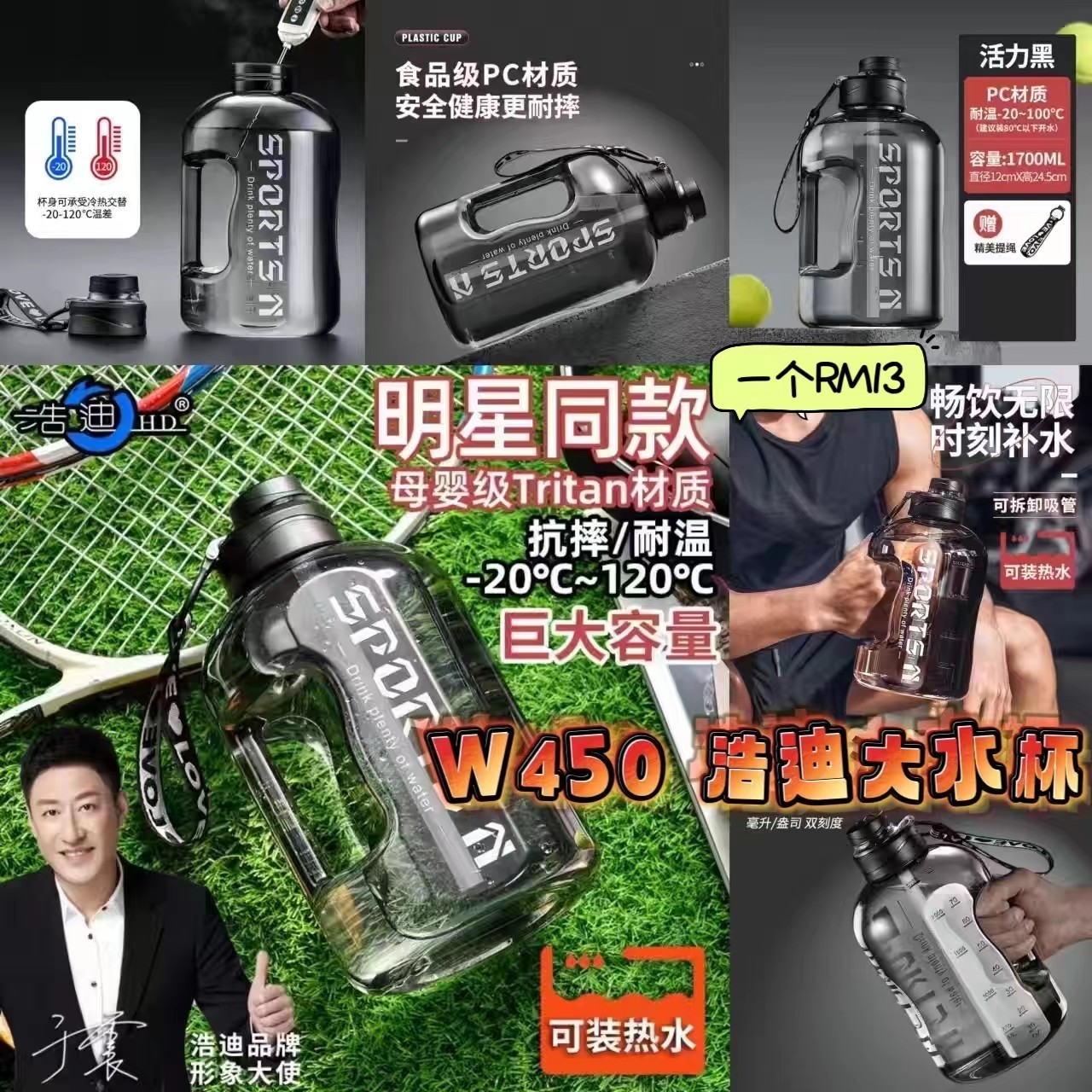浩迪水杯大容量吨桶吨运动健身便携塑料新款太空壶大肚杯,1700ml大容量