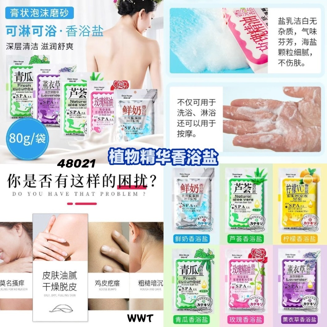 它可以软化角质、淡化鸡皮,先淋浴全身,然后把浴盐按摩全身3-5分钟,洗完爽滑不紧绷,温和安全又滋润,一包80G,一个星期用一次就行👍🏻