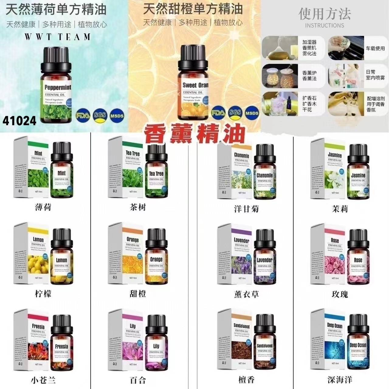 | 味道4 | 薄荷, 柠檬, 小苍兰, 茶树, 甜橙, 百合, 洋甘菊, 薰衣草, 檀香, 茉莉, 玫瑰, 深海洋 |