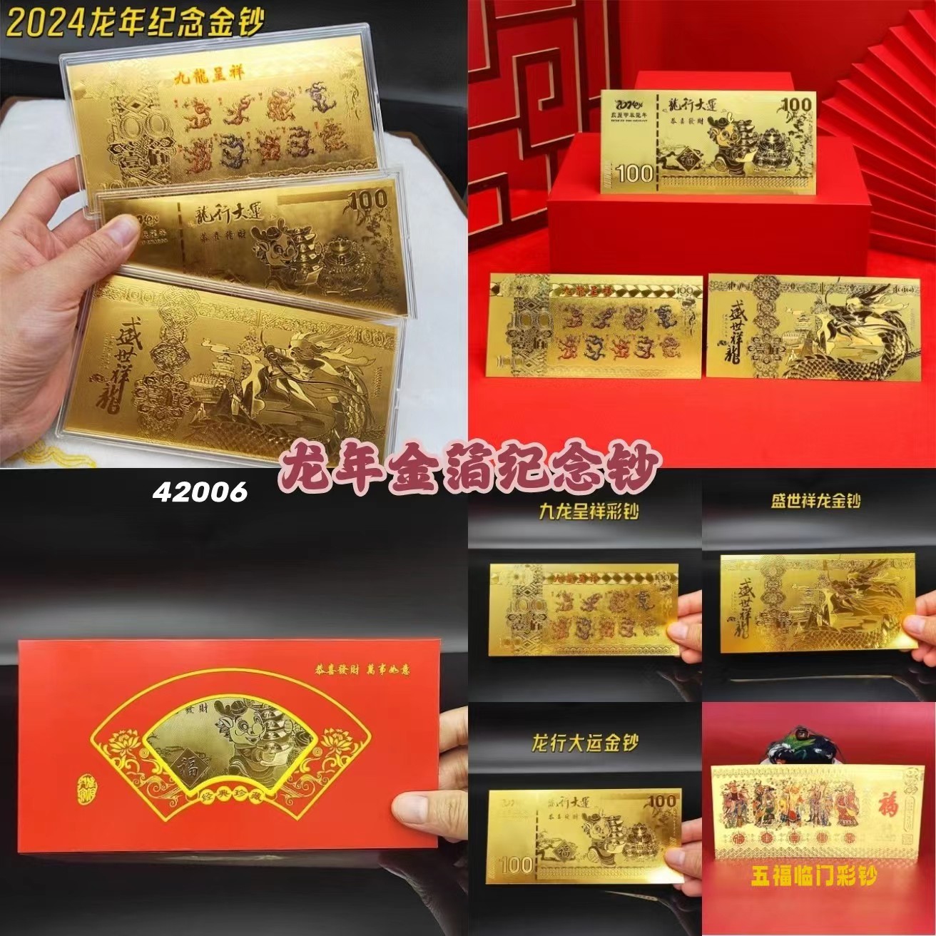 | 款式1 | 九龙呈祥彩钞, 盛世祥龙金钞, 龙行大运金钞, 五福临门彩钞 |