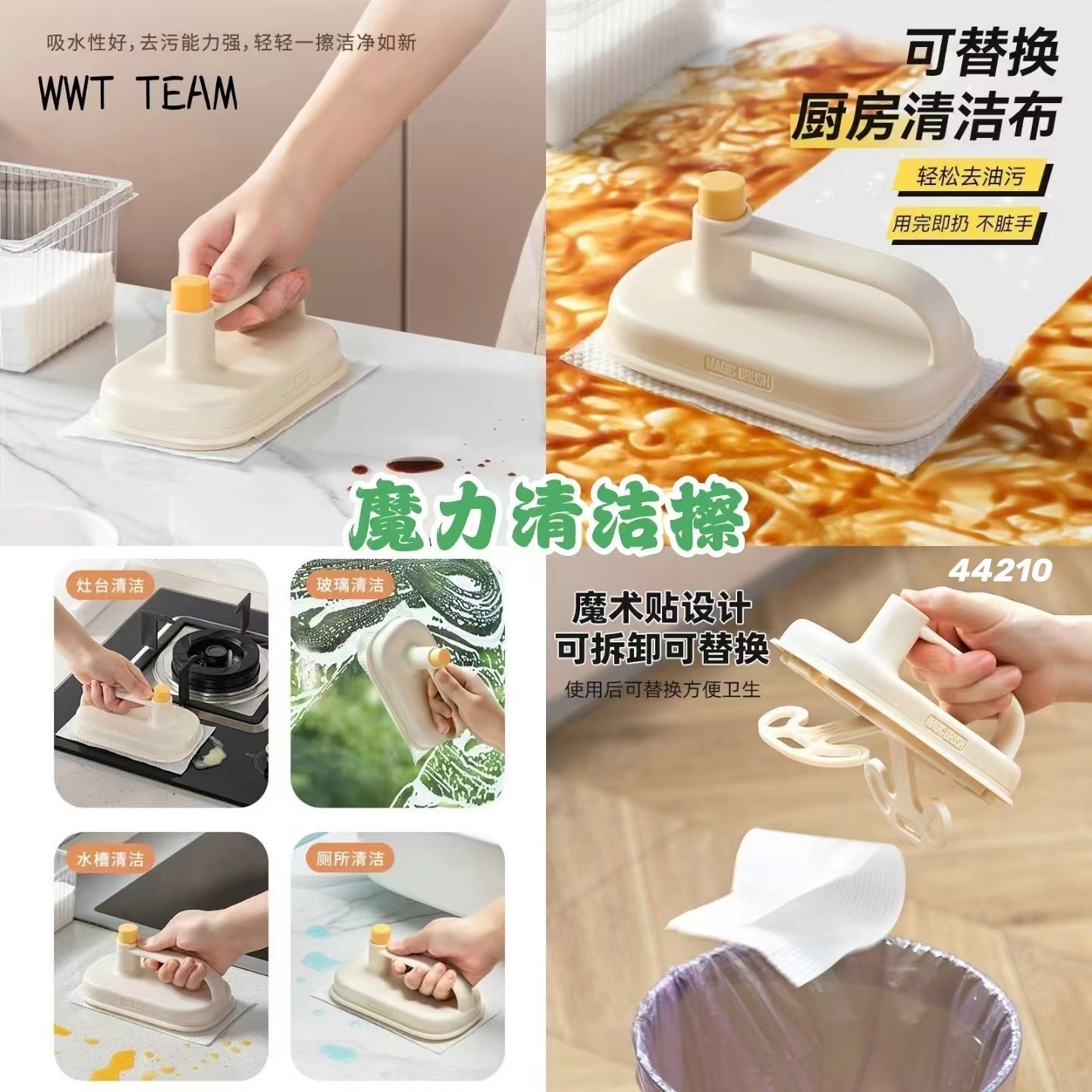 这款必须好评👍,我家用好久啦,手柄设计,清理厨房不会搞到手肮脏油腻,魔术贴设计,替换布还是纸巾可以吸在底部,可以拆卸更换替换布,用完就丢!