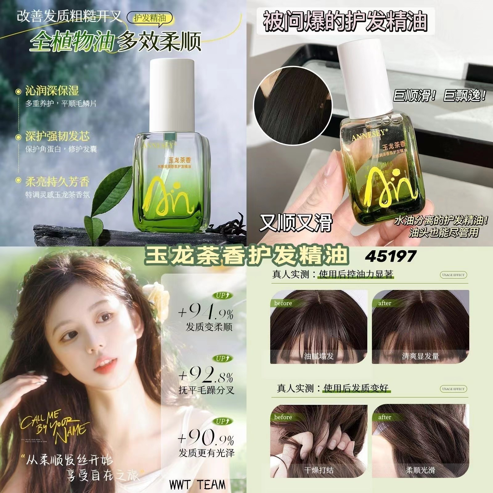 成分有澳洲坚果油、中国椰子油,5重植萃油,1秒吸收,有效抚平毛躁、改善发质,让头发更柔顺❤,发质更有光泽🥰🥰,任何发质都能用,一支35ml
