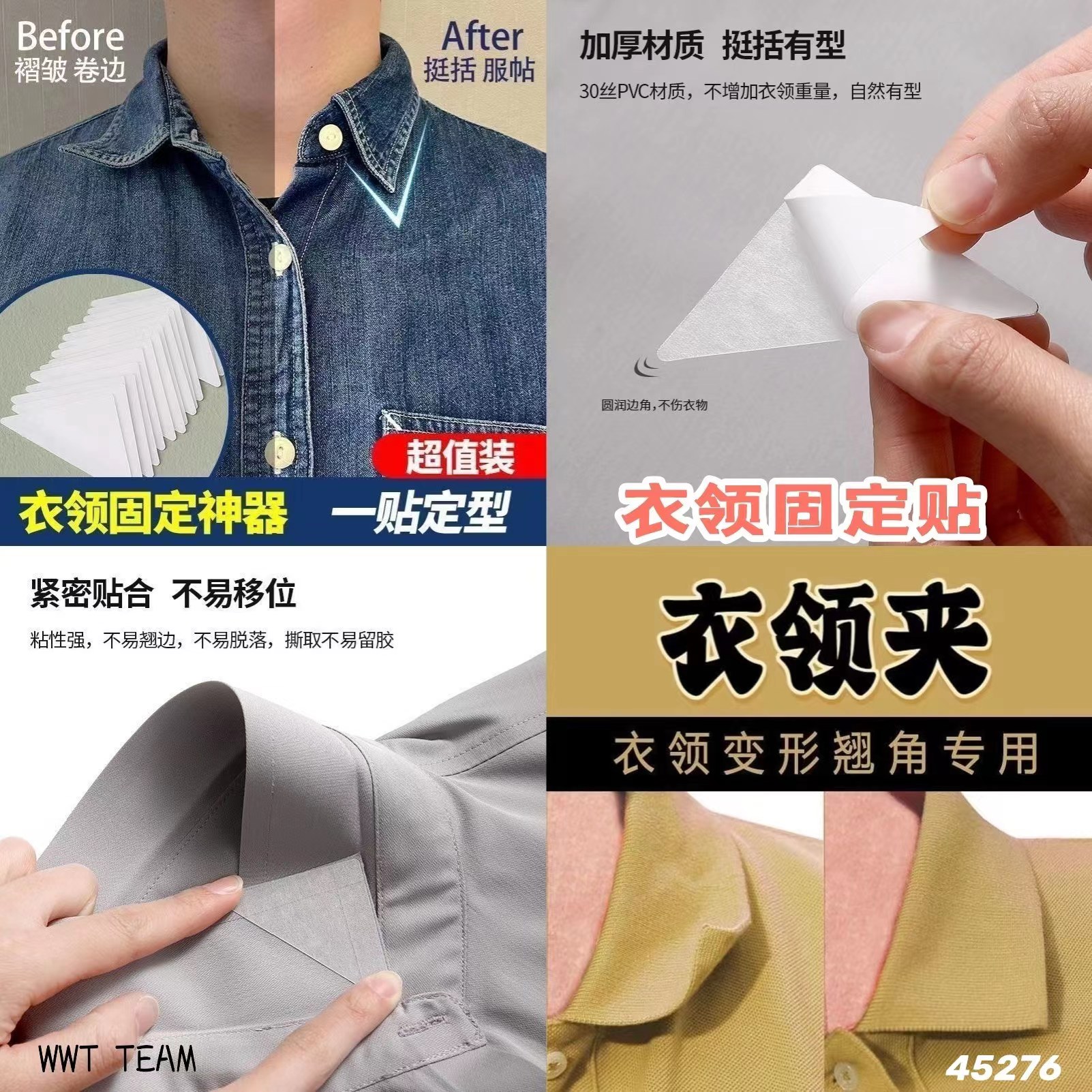 这款固定贴就是救星😎😎,一贴一撕,一秒搞定,贴合衣物不外露,符合领角形状,粘性持久,撕去后不容易留胶,牢固耐用❤,一盒30片