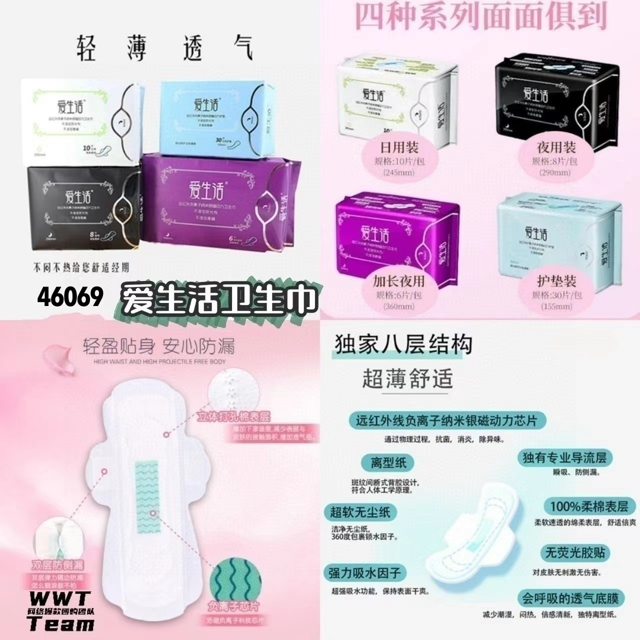 | 款式6 | 蓝色护垫, 白色日用, 黑色夜用, 紫色加长夜用 |