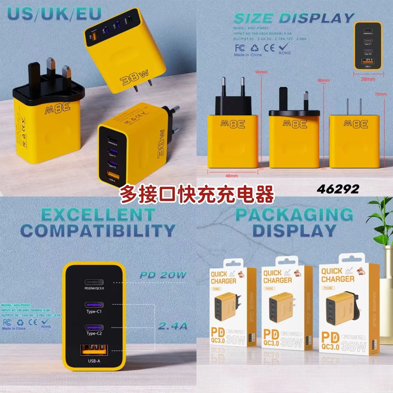 38w快速充电,还有LED灯显示,type c和USB充电口,适合一人多机使用,而且还有三种插头任您选择,出国旅游也可以使用✅